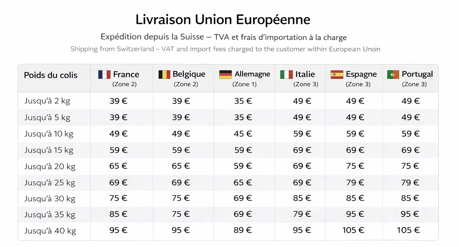 Pour les commandes expédiées vers l’Union Européenne, les produits sont facturés hors TVA suisse conformément à la législation applicable aux exportations.