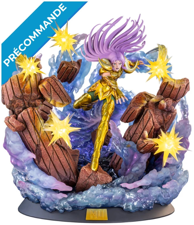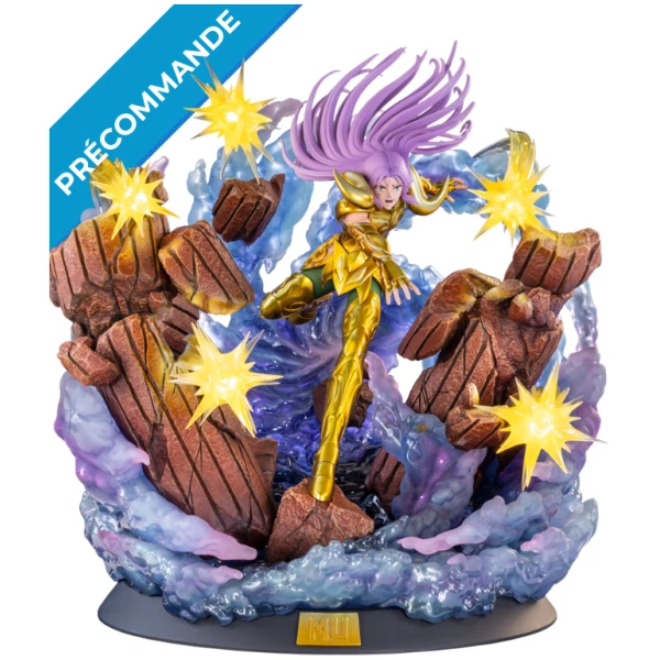 Cette statue représente Mû du Bélier attaquant l’ennemi dans l’épisode « Le Groupe vêtu de noir » de l’Arc Sanctuaire d’Hadès. Alors que le Chevalier d’Or pénètre dans le Temple du Cancer en triste état après l’attaque de Shaka, il se retrouve paralysé par psychokinésie et cerné par les 108 étoiles maléfiques de l’armée d’Hadès, à la recherche de Saga et ses compagnons. Tandis que Gigant du Cyclope de l’étoile terrestre Violente s’apprête à lui asséner le coup fatal, Seiya de Pégase l’en empêche. L’énergie paralysant Mû ordonne alors au Spectre de partir au Temple du Lion, c’est ainsi que Mû rencontre Myû, le Spectre du Papillon de l’étoile terrestre Féérique.
