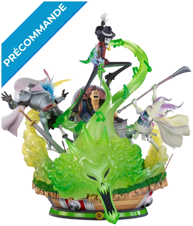 Cette statue le représente lors de son combat épique contre les sbires de Big Mom. Il utilise non seulement son épée mais également sa capacité qui lui permet de séparer son âme de son corps pour se déplacer rapidement et surprendre ses adversaires. Cette capacité est représentée ici avec un effet phosphorescent.