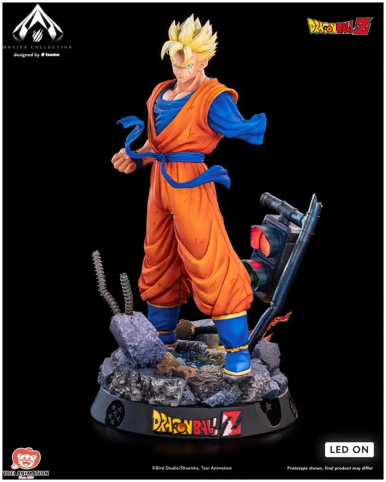 La Movies Collection rend hommage aux moments emblématiques des films Dragon Ball Z. La base inclut des éléments comme la flaque d’eau sous la pluie battante et le feu rouge qui clignote grâce à un système LED, capturant l’intensité des combats.