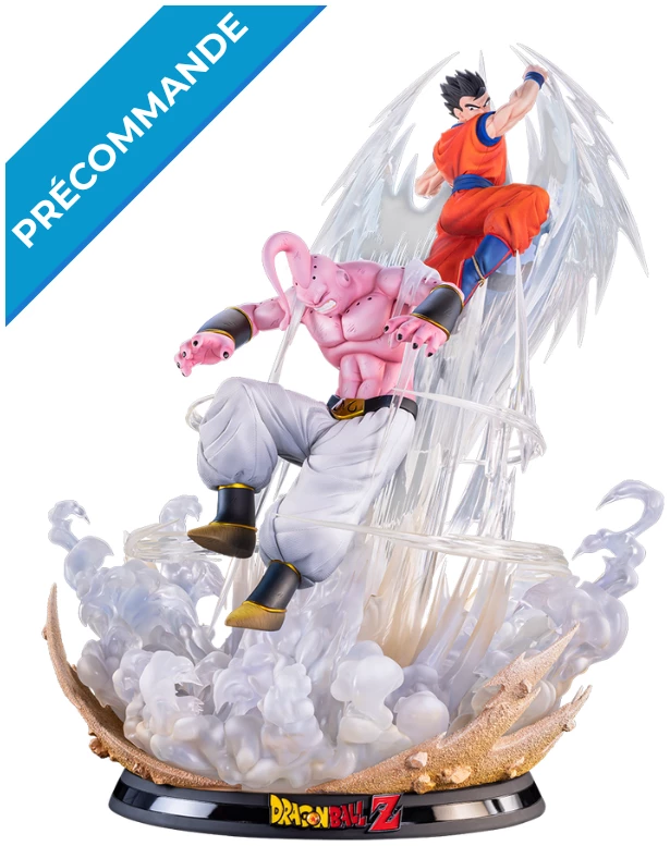 Cette statue HQS de Gohan vs Buu met en scène Mystic Gohan arrivant sur Terre pour affronter Super Boo dans l’épisode « Bû écrasé!! La miraculeuse puissance de Gohan », étant le seul à pouvoir sauver les siens et la planète ! Déterminé à stopper net son impitoyable adversaire dans sa folie destructrice et meurtrière, il apparait ici sous sa forme ultra puissante d’Ultimate Gohan, acquise après que le Vieux Kaïô Shin lui ait permis de réveiller son pouvoir caché, comme le montre l’aura blanche en résine transparente l’entourant. Après avoir anéanti ses créateurs, Super Boo se délecte à l’idée de radier la terre et toute forme de vie de l’univers et ne laissera rien ni personne entraver sa réjouissante mission de totale destruction. Cette forme plus impressionnante et musculeuse de Majin Boo est le résultat d’Evil Boo ayant dévoré Good Boo sous forme de chocolat. Devenu beaucoup plus puissant avec une capacité mentale accrue, le génie insatiable est pris d’un accès de colère extrêmement dangereux, possédant même le pouvoir de déchirer les murs dimensionnels.