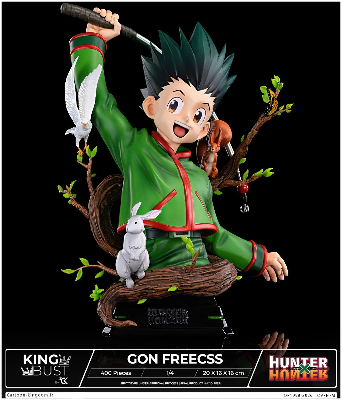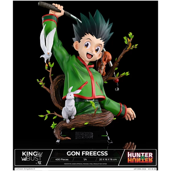 King Bust est une gamme de bustes premium à l’échelle 1/4, avec décor intégré, qui met en lumière chaque personnage à travers une mise en scène soignée, un souci du détail extrême, et une représentation puissante de la moitié supérieure du héros. Nouvelle licence sur cette ligne de produit et ce n’est autre que Hunter X Hunter avec Gon Freecss. Un décor immersif qui met en avant son univers de prédilection, la forêt avec pas moins de 4 animaux à ses côtés.