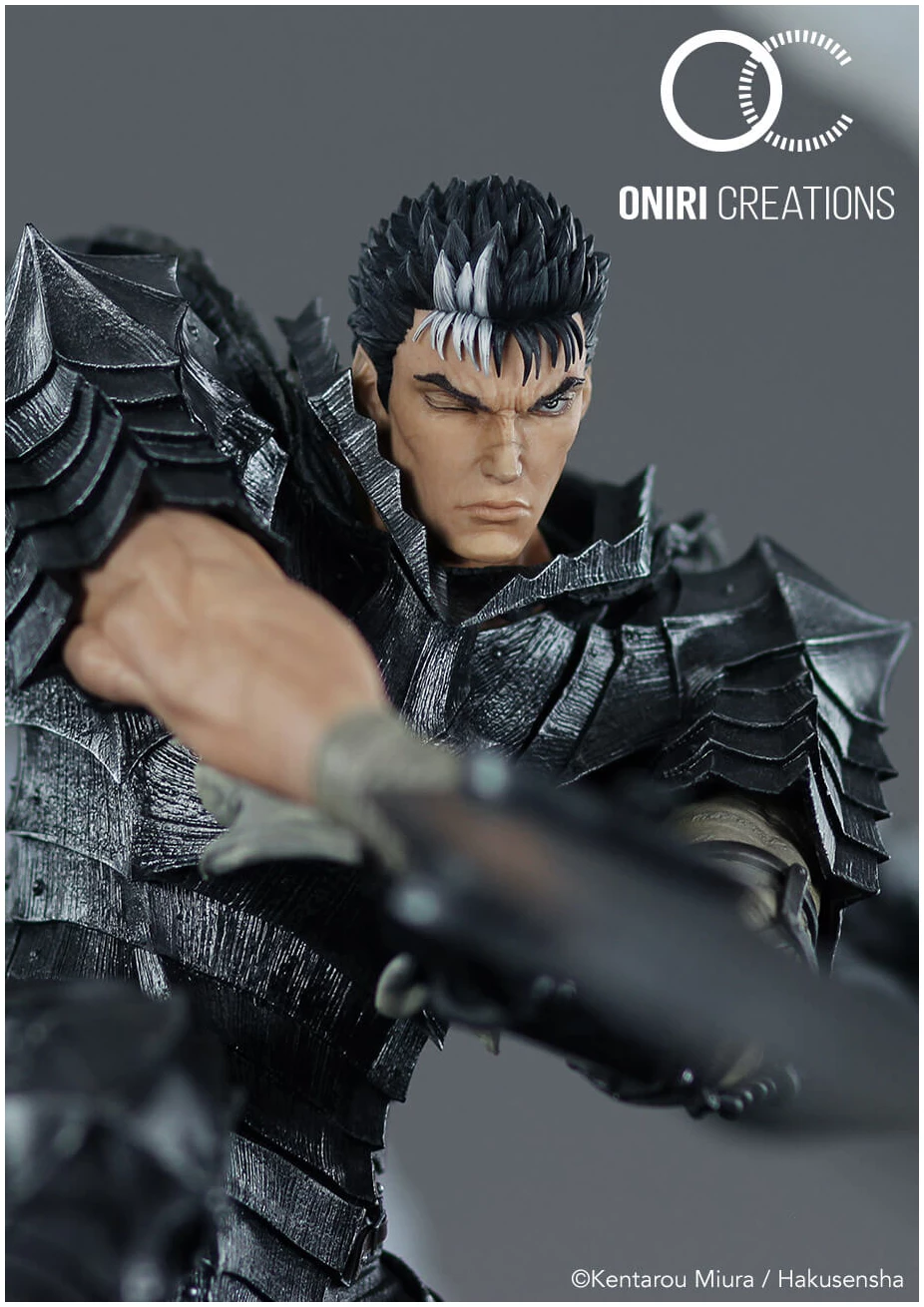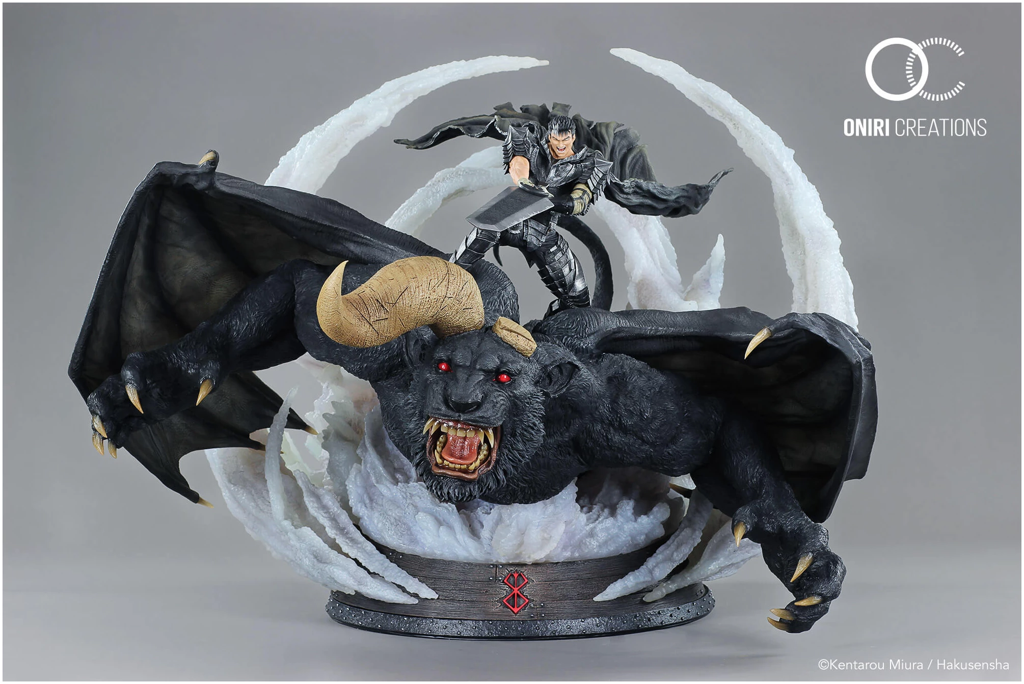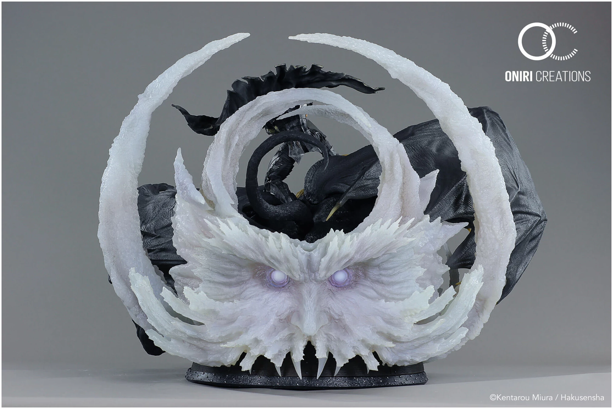 D’un point de vue technique, nous avons incorporé dans ce diorama de nombreux matériaux haut de gamme afin d’apporter au rendu global un réalisme accru. Ainsi, les parties peau de Guts sont réalisées en résine semi-translucide. La peau semble respirer, les veines subtilement peintes ajoutant au réalisme. Pour Zodd, nous voulions absolument que les griffes soient translucides. Un vrai défi technique en terme de moulage. Les ailes de Zodd ne sont bien évidemment pas en reste puisqu’elles sont faites en résine « clear » puis peintes de nombreuses couches d’encres transparentes. Ses ailes laissent subtilement passer la lumière, leur aspect semble alors organique et naturel. En vous rapprochant des ailes vous distinguerez les veines qui composent la membrane. Tout a été détaillé au maximum. Les parties dents et langue de Zodd sont également en résine translucide, teintées à l’aide d’encres. Le vernis brillant appliqué à la fin de ce processus donne vie au personnage. Nous ne voulions pas que le focus se fasse uniquement sur Guts et Zodd. Le vortex qu’ils traversent est traité comme un personnage à part entière. Au travers de la sculpture regorgeant de détails subtils, mais aussi du matériau utilisé. Les parties « nuages » sont faites en résine semi-translucide que nous teintons par la suite avec des tons allant du gris au bleu, en passant par le mauve. Les reflets variant selon comment vous regardez la pièce, et selon l’éclairage utilisé. Pour le socle, nous avons choisi quelque chose d’épuré dans un style moyenâgeux fait de bois et de métal avec en son centre la marque du sacrifice. La statue a demandé de nombreux mois de travail à toute l’équipe et nous espérons qu’elle ravira tous les fans de Berserk !