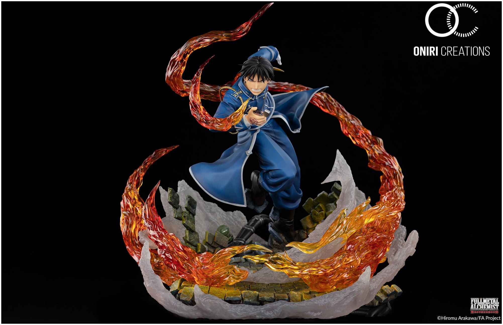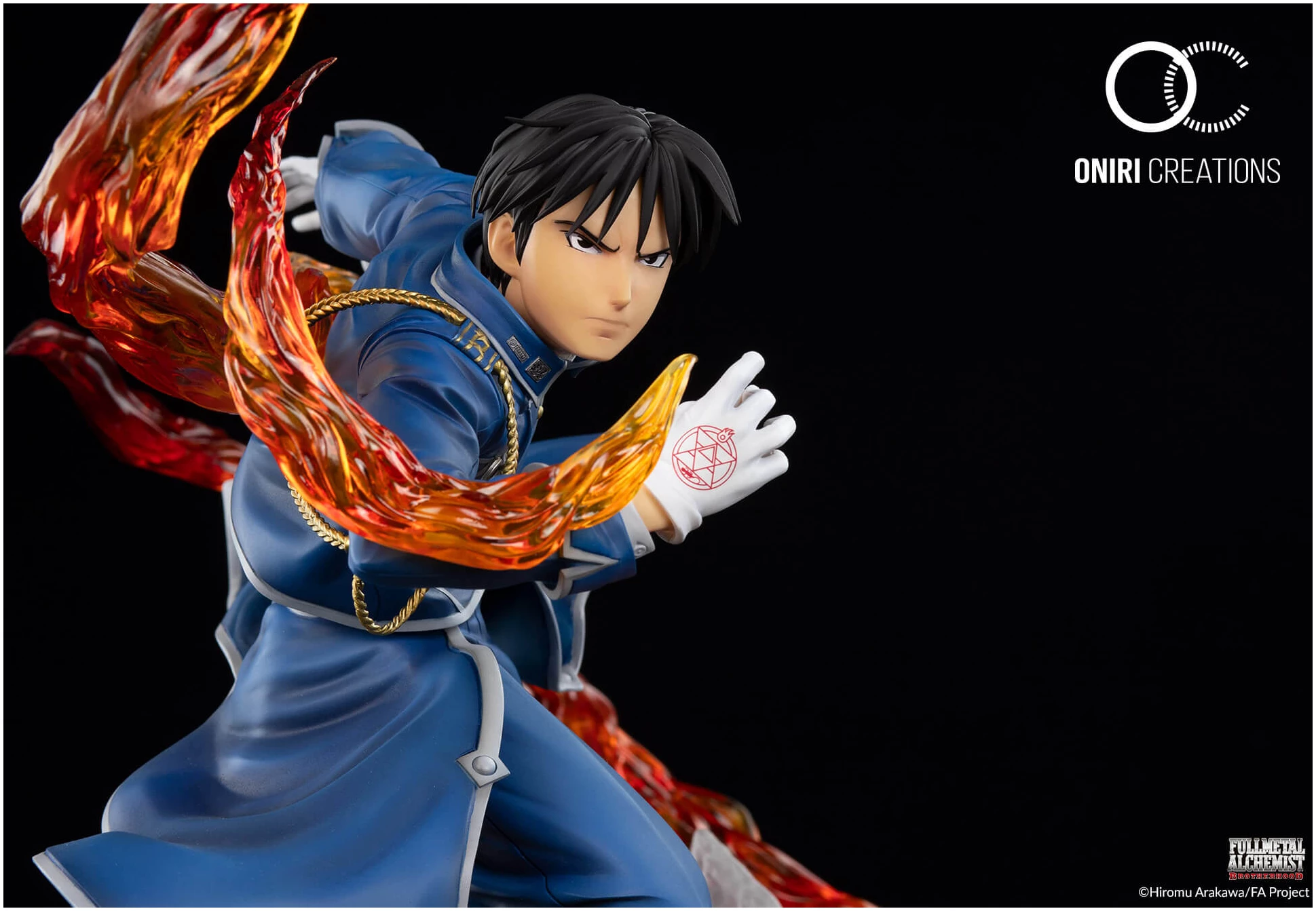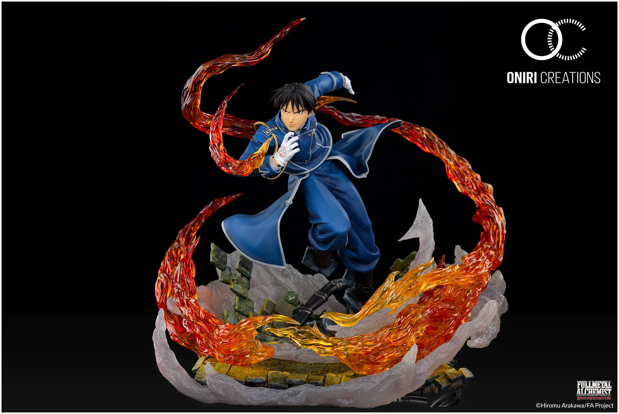 Après Edward Elric, nous continuons la gamme Fullmetal Alchemist avec le célèbre alchimiste de flammes, Roy Mustang. Personnage central de la série Brotherhood, Roy est un alchimiste d’État puissant doté d’un gant gravé d’un Cercle de transmutation lui permettant de créer du feu d’un simple claquement de doigts. Notre statue s’inspire de son combat face à Envy dans lequel Roy laisse parler sa colère et son incroyable pouvoir. Face à la déferlante de flammes, l’Homunculus ne peut rien contre le Colonel.